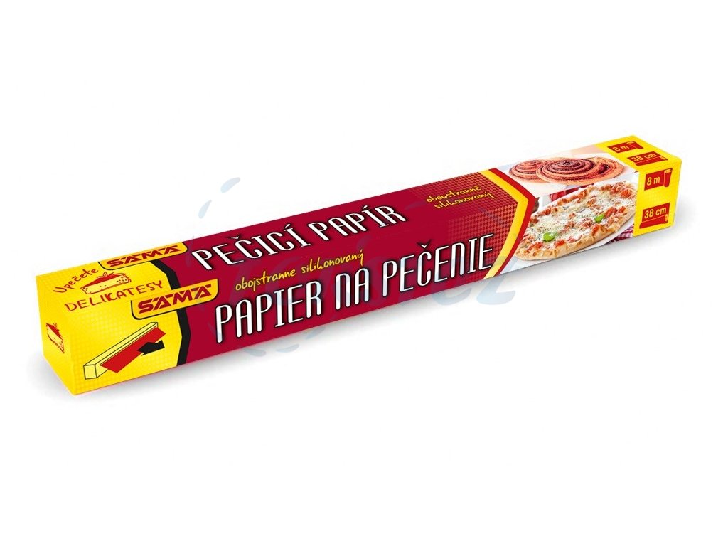 Pečící papír SAMA šíře 38cm návin 8m hnědý. Obostranně silikonovaný hnědý pečící papír. Uchovává aroma potravin, pečící papír SAMA je vhodný na přípravu dietních jídel bez tuku na pánvi, pečící papír je vhodný do mikrovlnné trouby. Žádné vymazávání a připékání plechů