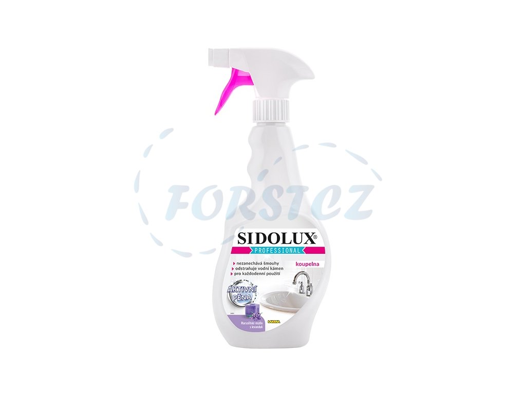 SIDOLUX Professional Koupelny – Marseillské mýdlo & levandule, 500 ml – účinný čistič s aktivní pěnou, který zajistí dokonalou hygienu a svěží čistotu ve vaší koupelně. Speciální složení si poradí s vodním kamenem, zbytky mýdla i jinými nečistotami. Aktivní pěna ulpívá na povrchu, déle působí a zabraňuje stékání. Povrchy zůstanou zářivě čisté a provoněné jemnou vůní marseillského mýdla s levandulí.